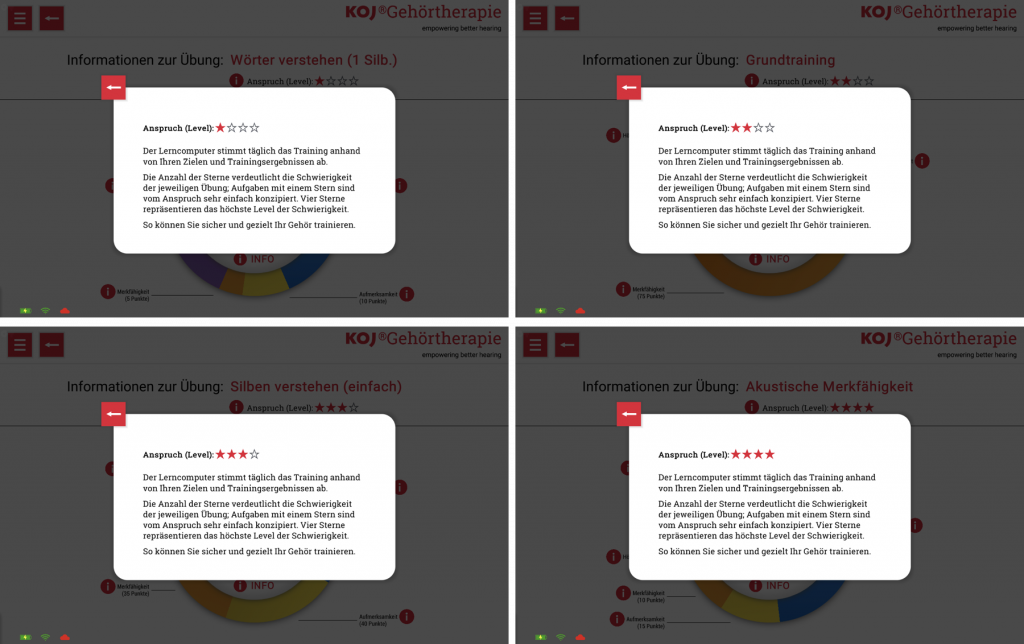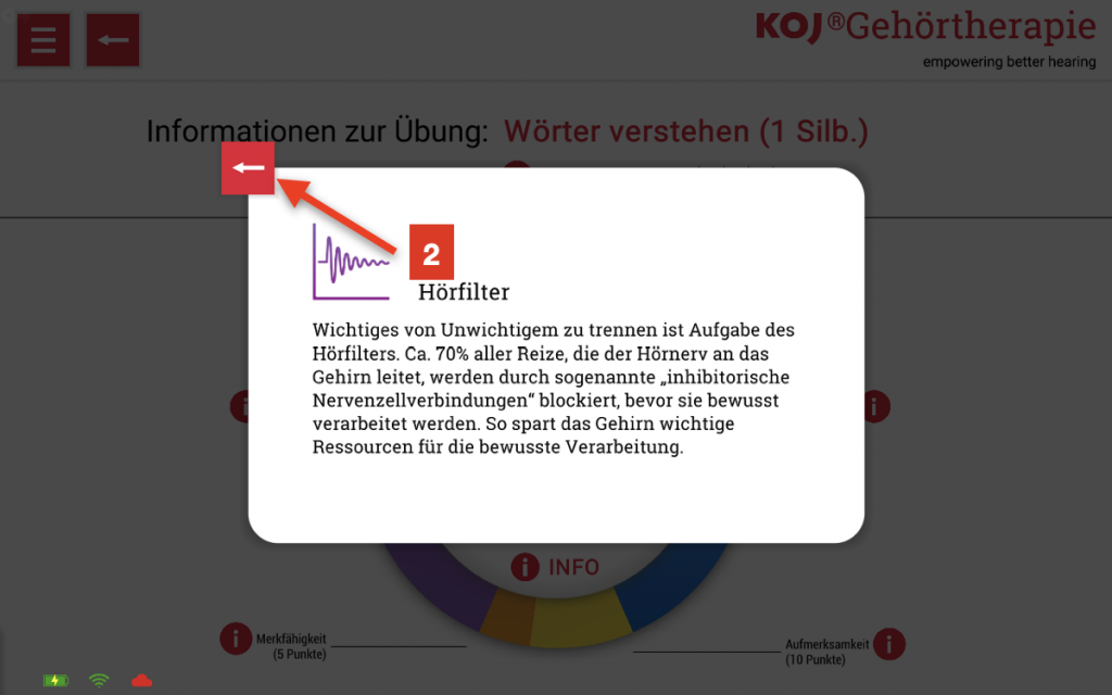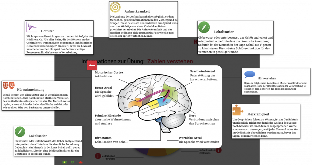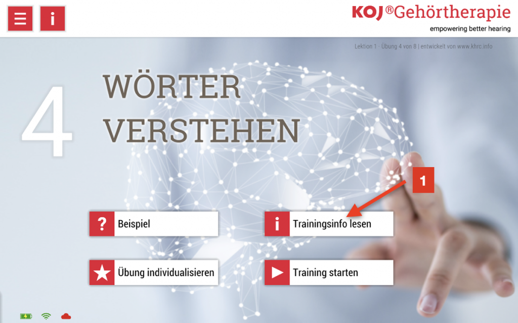 “TRAININGSINFO LESEN” (1) zeigt bei jeder Übung an, welche Kognitiven Disziplinen, mit welchem Anteil trainiert werden und mit welchem Anspruch (Level) der Lerncomputer die Übung anhand der Patientenziele und dem Trainingsergebnis abgestimmt hat.