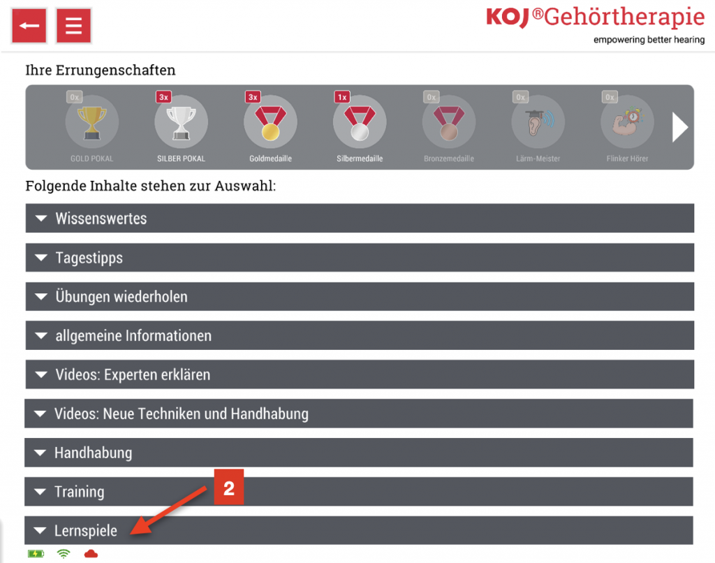 Durch tippen auf (1) weitere Inhalte, gelangen Sie zu den Lernspielen.