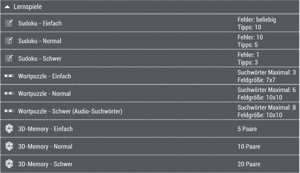 Dazu scrollen Sie zum Ende der Seite und öffnen den Menüpunkt (2) Lernspiele, dort haben Sie zwischen drei Lernspielen (Sudoku, Worträtsel, 3D-Memory) in verschiedenen Schwierigkeitsgraden (Einfach, Normal, Schwer) die Auswahl.